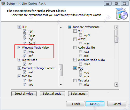 4、后面按默認安裝即可,在這個界面可以看到wmv格式勾選了;