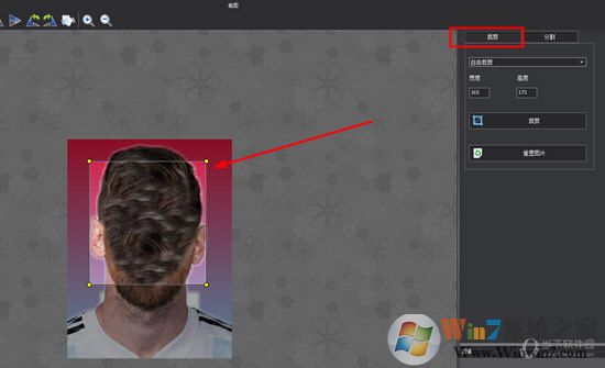 2、彈出分割的界面后,一共有兩種切割方式供大家選擇,大家可以在右邊的功能欄中在找到“裁剪”和“分割”找到兩種功能,先來說說裁剪,小編選擇的是自由裁剪,裁剪就是利用裁剪框進行照片圖片的選擇,選擇框中的區(qū)域就是保留的最終區(qū)域,如下圖所示: