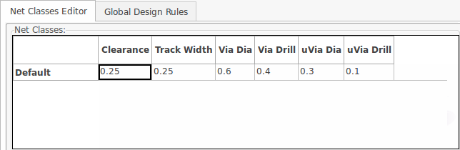 3. 我們最好先根據(jù)你的PCB制造商的要求設(shè)置一下兩條線的最小間隙(Clearance)和線條的最小寬度(Minimum track width)。通常,你可以設(shè)置最小間隙為0.25,最小線寬為0.25。點(diǎn)擊菜單Design Rules → Design Rules,選擇Net Classes Editor標(biāo)簽,修改最小間隙(Clearance)為0.25,修改線寬(Tarck width)為0.25,這里的單位是mm。