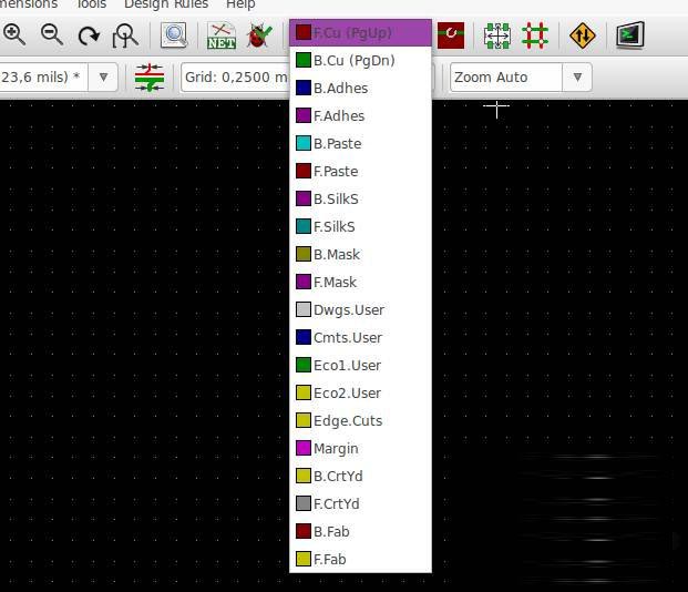 13. 現(xiàn)在,我們必須要選擇我們將要在哪個層上工作。在頂層工具欄中有個向下拖動的菜單,選擇F.Cu (PgUp)層。這個層就是電路板的頂部覆銅層。(就是我們熟知的toplayer)