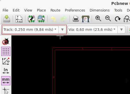 ,點(diǎn)擊J1的PIN1腳,連接到R2的焊盤上,然后雙擊結(jié)束這條線的繪制。這條線的寬度是默認(rèn)的0.25mm,在頂部工具欄的最左邊,有個下拉菜單,可以選擇線的寬度,不過,默認(rèn)情況,只有一種線寬可選。如下圖所示: