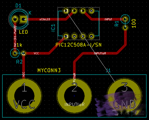 ,連接J1的PIN3和IC1的PIN8。(這個操作其實(shí)也沒有必要非要做,因?yàn)槲覀兘酉聛韺⒃诘讓痈层~鋪地。)注意一下這跳線的顏色和其它線的顏色是不同的。