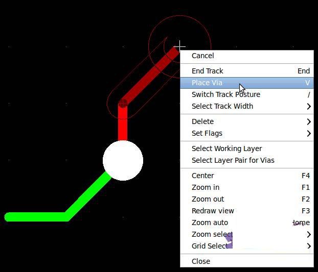 21. 頂層的引腳A連接到底層的引腳B。這個可以用過孔來實(shí)現(xiàn)。當(dāng)你從頂層的引腳畫出一條線之后,右鍵后在菜單中選擇Place Via(放置過孔),或者直接點(diǎn)擊鍵盤上的V鍵,這時候就會自動跳轉(zhuǎn)到底層,然后你就可以在底層畫線完成你的連接。