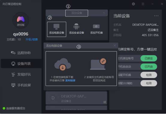 點擊“添加電腦設(shè)備”,在被控端電腦下載并安裝向日葵,登錄與本機相同的帳號密碼,即可將主機添加至帳號下。
