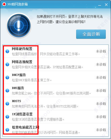 2、點(diǎn)擊“全面診斷”,它會(huì)自動(dòng)檢測(cè)網(wǎng)絡(luò)硬件配置、網(wǎng)絡(luò)連接配置、DHCP服務(wù)和DNS服務(wù)等信息。