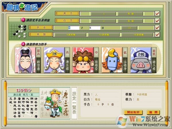2、中國圍棋敵人現(xiàn)有五人,難度系數(shù)排行為此為觀音菩薩、唐三藏、悟空、沙和尚及其豬八戒,在其中觀音菩薩難度系數(shù)最大,豬八戒難度系數(shù)最少,選中1個敵人后點一下剛開始圍棋對戰(zhàn)