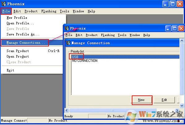 1、點(diǎn)擊File→Manage Connection,點(diǎn)擊NEW,鉤上USB→下一步→下一步→完成→Apply→close,如圖所示: