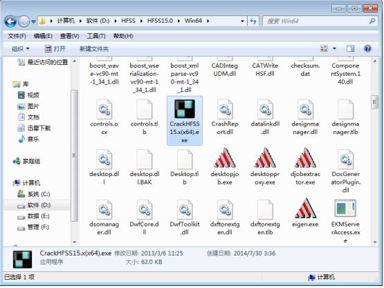 7、進(jìn)入“HFSS_15.0_Win64【破解文件】”,復(fù)制“CrackHFSS15.x(x64).exe”到文件夾【W(wǎng)in64 】下(例:D:\HFSS\HFSS15.0\Win64 )。