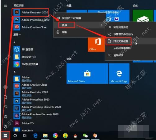 10、桌面沒有Ai快捷方式圖標(biāo)怎么辦?如何給Illustrator 2020新建快捷方式?點(diǎn)擊電腦左下方的開始,找到Adobe Illustrator 2020軟件圖標(biāo),右鍵單擊,在更多里面,點(diǎn)擊打開文件位置;此時會打開Adobe Illustrator 2020快捷方式所在的文件夾;