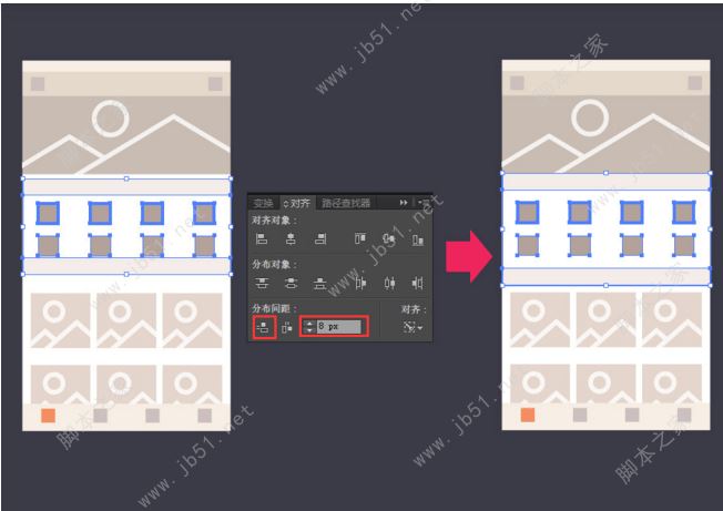 2、選中多個需要調(diào)整分布間距的對象,選中其中一個作為參照對象。調(diào)整當(dāng)中的間距,然后點(diǎn)擊相應(yīng)方向的分布按鈕即可。