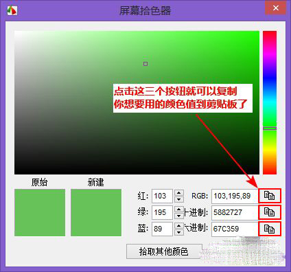 有“RGB”、“十進制”、“十六進制”三種方式可選,點擊這三種方式右邊的復制按鈕,即可將相應數(shù)值復制到剪貼板了