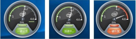 點(diǎn)擊一鍵超頻按鈕,執(zhí)行 CPU 超頻操作,超頻成功后,灰色部分會(huì)變成橙色,表示 CPU能到達(dá)新增的頻率范圍。如下面圖中所示,CPU 一鍵超頻后頻率指針可以從 4.2G Hz 擺動(dòng)到4.5G Hz。點(diǎn)擊一鍵恢復(fù)按鈕,CPU 會(huì)恢復(fù)到超頻前狀態(tài)。