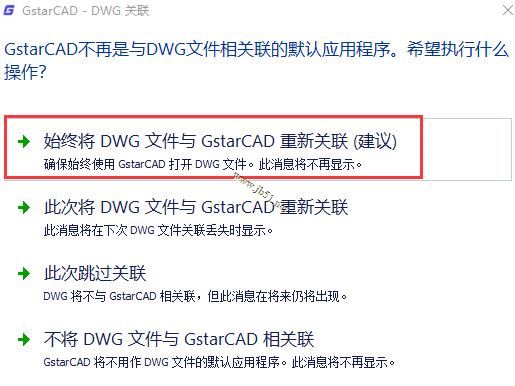 7、建議默認(rèn)選擇(始終將DWG文件與GstarCAD重新關(guān)聯(lián)(建議)),無需更改;