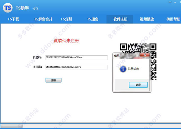 TS助手是一款非常強大,且免費使用的一體化TS工具,具有TS下載、解密合并、分割、加密等功能,支持視頻在線預(yù)覽播放功能,軟件綠色免安裝,打開之后輸入任意注冊碼即可注冊成功,親測可用,操作簡單,只需要簡單的幾個操作就能夠達到目的!