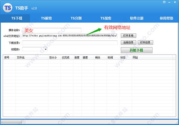①TS下載要填寫下載的視頻名稱,m3u8列表文件網(wǎng)絡(luò)地址 或 本地路徑,要確保網(wǎng)地址的存在,因為是網(wǎng)絡(luò)下載,當打開本地路徑時,里面的列表必須是網(wǎng)絡(luò)有效地址!還有下載目錄要填寫,下載線程數(shù)可以不填。