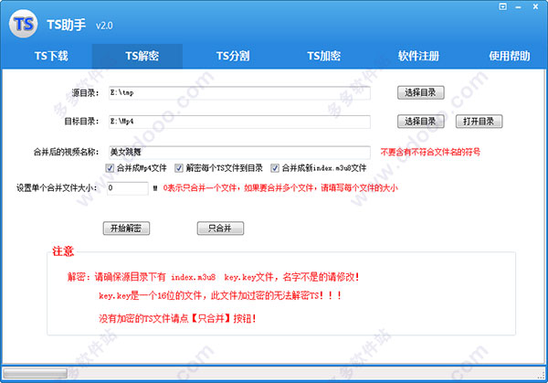 TS可以對加過密的文件可以解密,前提是要密鑰正確,網(wǎng)上有些教學(xué)課件目前無法解密!解密是可以只要一個合并的mp4文件,也可以把每個TS切片解密,也可以對沒有加密的TS切片進行按指定大小合并!首先要求源目錄中有 ts文件 index.m3u8列表文件,ts文件與列表文件中的名字 或路徑要一樣,如果加密的還要有 key.key密鑰文件,名字不是的更改一下!