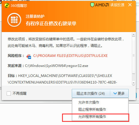 7、再出現(xiàn)的360提醒中,選擇“允許程序所有操作”,否則將無法注冊成功