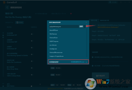 4、優(yōu)先啟動(dòng)游戲,才能根據(jù)游戲的進(jìn)程,進(jìn)行注入修改,如自動(dòng)檢測(cè)沒(méi)有該游戲的正確進(jìn)程可以手動(dòng)在文件夾進(jìn)行添加。然后點(diǎn)擊加個(gè)BUFF,啟動(dòng)即可。