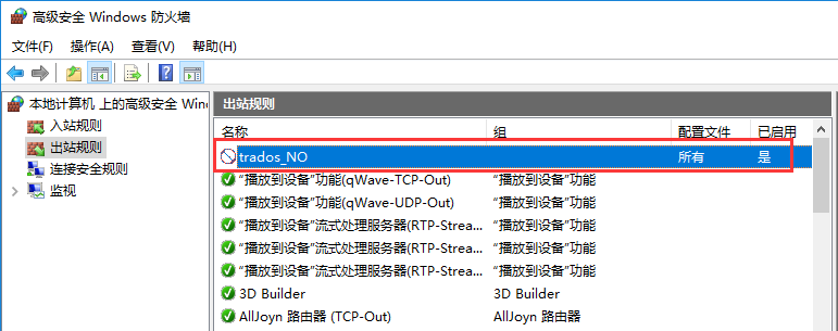 5、這樣,我們創(chuàng)建的trados_NO規(guī)則就顯示在windows防火墻里,現(xiàn)在我們重啟下計(jì)算機(jī)用以確保規(guī)則生效。
