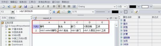使用select函數(shù)從數(shù)據(jù)集ds1中選取雇員字段列的所有值,該組字段值保留了一個(gè)指針,指向數(shù)據(jù)集中的源記錄,該組字段值和數(shù)據(jù)集中的記錄保持一一對(duì)應(yīng)的關(guān)系,因此在當(dāng)前格的附屬單元格里可直接通過(guò)dsn.colname表達(dá)式檢索,而不需要重復(fù)的使用select函數(shù)取數(shù),如B2,C2等。