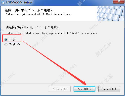 1、將winwin7分享的壓縮包解壓出來,雙擊“USR-VCOM_V3.7.2.525_Setup.exe”,在安裝向?qū)е?,選擇“中文”,并點(diǎn)擊“Next”,見下圖所示: