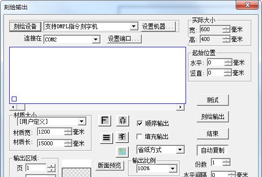 排版好后,并且刻繪機準備就緒后。依次點擊“文件”“刻繪輸出”,在彈出窗口內選擇已連接好的刻繪機,注意選擇合適的材質寬度,點擊“版面預覽”按鈕,看上方白框顯示是否合適,基本尺寸合適、字體居中,就可以點擊“刻繪輸出按鈕”開始刻字。
