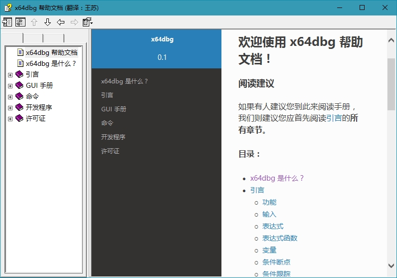 3. 對 x64dbg 幫助文檔的主要內(nèi)容進(jìn)行了漢化,并按照最新版進(jìn)行了修訂、翻譯。對界面字體以及布局重新進(jìn)行了設(shè)置。將默認(rèn)調(diào)用在線英文幫助更改為調(diào)用本地的中文幫助文件。