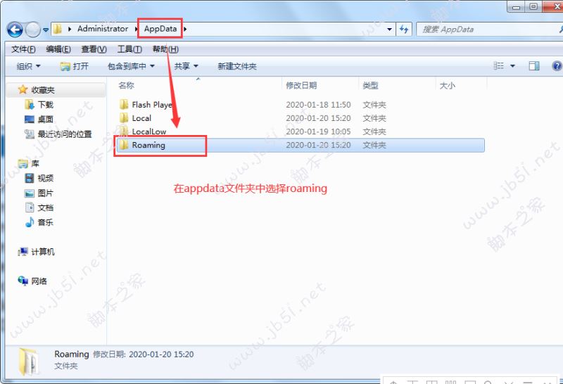 4.在appdata文件夾中,找到Roaming文件夾,并且打開此文件夾,如圖