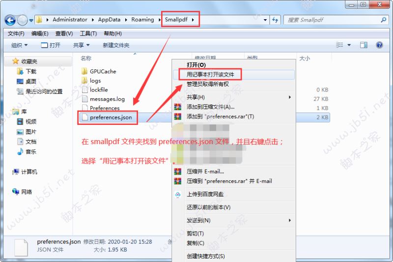 2.然后找到“preferences.json”文件,preferences.json文件目錄:C:\Users\你的用戶名\AppData\Roaming\Smallpdf\preferences.json;