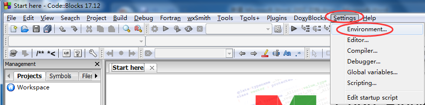 3) 打開(kāi) CodeBlocks,選擇 “Settings --> Environmen”,如下圖所示: