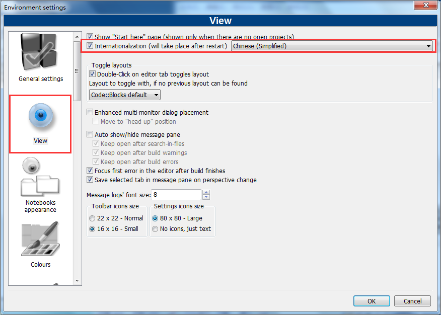 選擇 View 選項(xiàng),勾選 Internationalization 選項(xiàng),同時(shí)選擇其中的 Chinese(Simplified)。然后點(diǎn)擊 OK 按鈕。