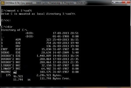 8.顯示下一下DOSbox中c盤下面的文件C:\>dir,見下圖所示: