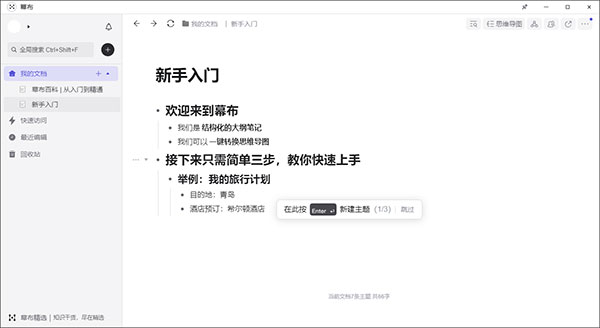 幕布PC客戶(hù)端是一款能夠?qū)⑺季S以樹(shù)形結(jié)構(gòu)方式快速整理,書(shū)寫(xiě)成文的思維導(dǎo)圖軟件,用戶(hù)可以用更高效的方式和清晰的結(jié)構(gòu)來(lái)記錄筆記、管理任務(wù)、制定工作計(jì)劃、頭腦風(fēng)暴,幫助用戶(hù)釋放您的大腦,與傳統(tǒng)筆記工具以平面式敘事形式的記錄方式不同的是,幕布思維導(dǎo)圖更專(zhuān)注結(jié)構(gòu)化的思維記錄,把筆記結(jié)構(gòu)化記錄,條例清晰,層層分明,便于加深用戶(hù)的理解。使用過(guò)程需要用到 Enter、Tab和Shift+Tab 三個(gè)快捷鍵,書(shū)寫(xiě)結(jié)果采用樹(shù)形結(jié)構(gòu)分布,整個(gè)過(guò)程簡(jiǎn)單上手,結(jié)果直接預(yù)覽或者一鍵轉(zhuǎn)化成思維導(dǎo)圖。