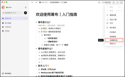 方法一:在文檔編輯頁(yè)面的右上角點(diǎn)擊【···】更多,再點(diǎn)擊【快捷鍵列表】;