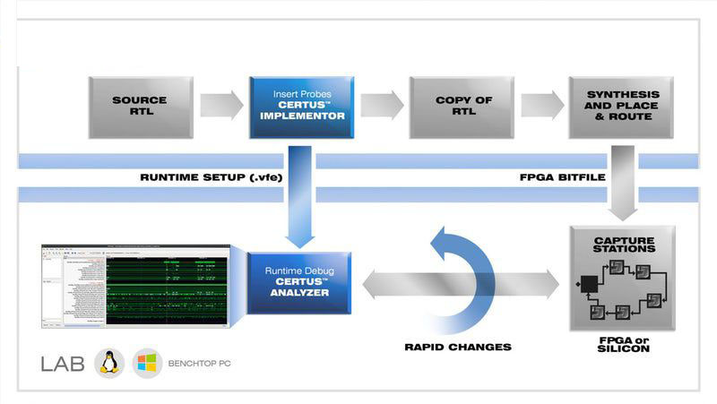 通過實現(xiàn)高達(dá)數(shù)萬個信號的測量,實現(xiàn)了調(diào)試系統(tǒng)和芯片級問題,能夠捕獲非常深的痕跡。無論您的目標(biāo)FPGA實施流程如何,輕松的軟件驅(qū)動,運行時可配置性都可以消除昂貴的重新測試自旋,見下圖所示: