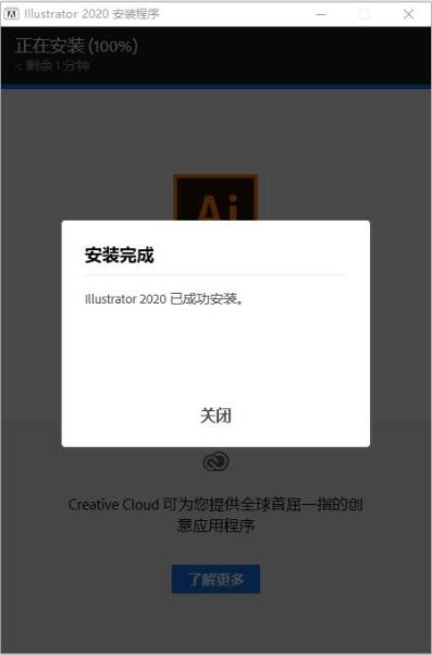 3、AI2020 安裝完成,點(diǎn)擊關(guān)閉,如圖所示: