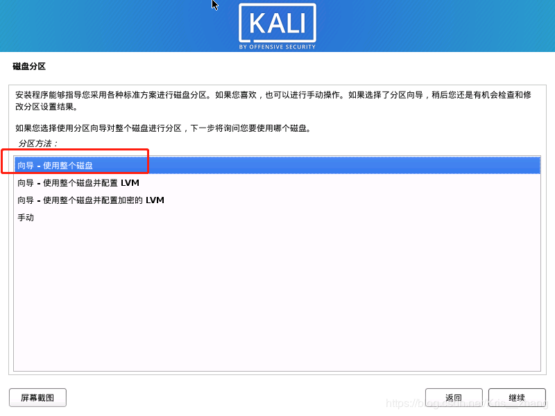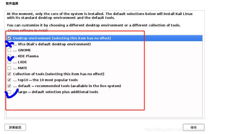 注意:這里需要選擇kde桌面環(huán)境(我不喜歡首選,kde桌面要好看一些,桌面環(huán)境選其中一個(gè)就行),否則安裝完畢后Kali Linux將無(wú)法使用圖形化桌面環(huán)境,只能使用命令行環(huán)境
