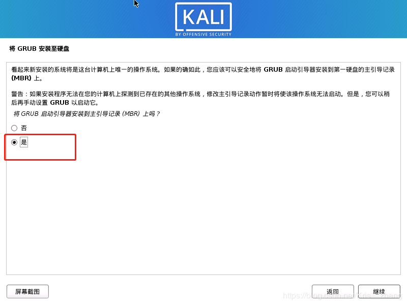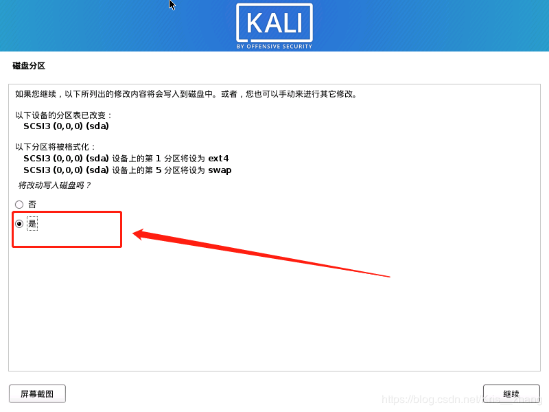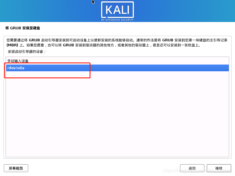 選擇“是”,注意選擇設(shè)備為“/dev/sda”