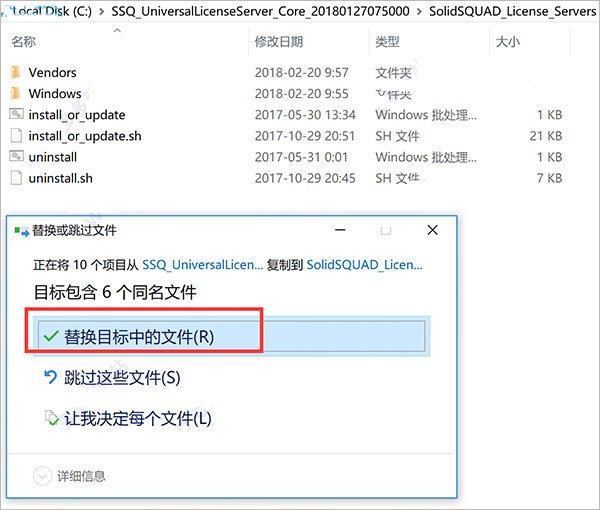 4、把SSQ_UniversalLicenseServer_Module_SiemensPLM_20180127075000文件夾內(nèi)的Vendors文件夾復(fù)制到SSQ_UniversalLicenseServer_Core_20180127075000文件夾內(nèi)SolidSQUAD_License_Servers目錄下,需要替換舊替換;