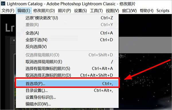 1、首先我們需要知道調色預設放在哪個文件夾,打開LR——編輯——首選項