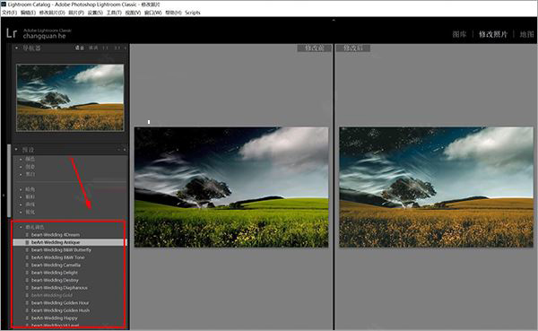6、重啟LR軟件,在預設欄即可看到婚禮調色,直接點擊就可以使用了