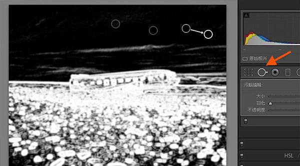 污點清除是特別便捷的專用工具,特別是在如果你要解決的是攝像鏡頭入塵,又或一些簡單污點(如湖中的枯葉),按Q鍵或如下圖箭嘴所說著的專用工具,就可開展消除。而更加關鍵的,便是下面的圖圓形部位,剔選得話會讓影象會變?yōu)槟z片,而且需要用滑軌來更改飽和度,以突顯有污點的地區(qū),那樣除去下去就舒服多了。要是沒有了下面的專用工具列,能夠按T鍵讓它再次發(fā)生。