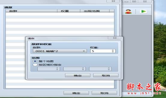 在敵群列表中雙擊出現(xiàn)遇敵設(shè)置窗口,敵群選擇框選擇敵群,權(quán)重:影響遭遇敵群出現(xiàn)的概率的數(shù)字。范圍:自動遇敵的地圖位置,整個地圖或者指定區(qū)域。
