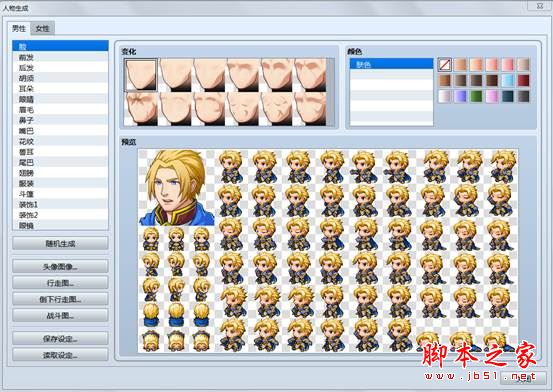 選擇右邊第二個工具開啟人物生成窗口。在這里可以繪制你制作的游戲需要的人物,對人物的性別、面相、服飾、頭像、行走圖、戰(zhàn)斗圖、倒下圖進行設(shè)置,也可以按隨機生成按鈕自動生成人物,按相應(yīng)按鈕保存到游戲相應(yīng)的文件夾里面,在游戲制作中調(diào)用,如圖: