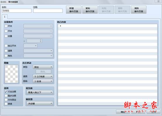 游戲中所有的事件指令都通過這個窗口進行操作。 在游戲運行的過程中如果要取消該事件:我通常使用獨立開關(guān)操作,如上圖在事件執(zhí)行內(nèi)容中獨立開關(guān)a設(shè)置為on,新建事件頁面,出現(xiàn)條件選擇獨立開關(guān)a,其他都不設(shè)置。