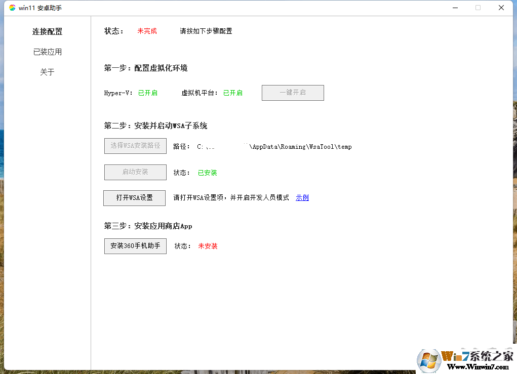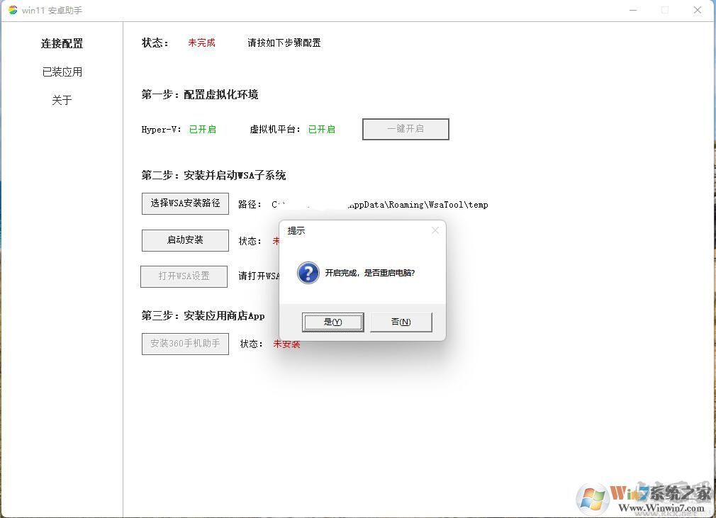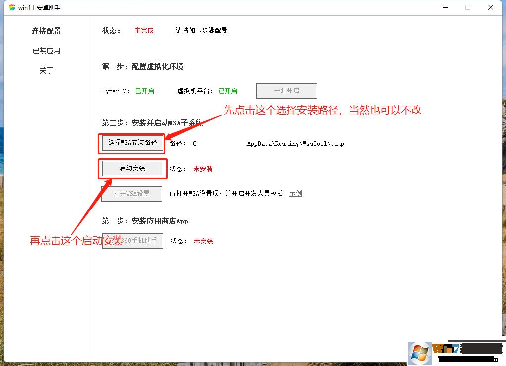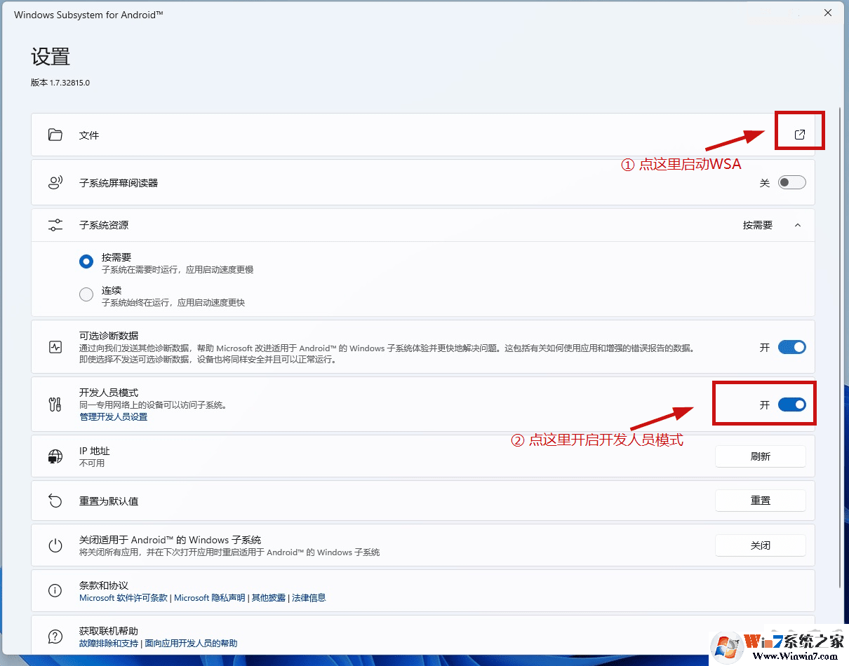 5.完成后點(diǎn)擊“打開WSA設(shè)置”,按照下圖操作
