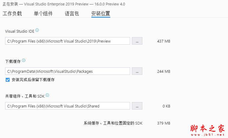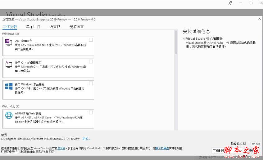 3、安裝界面,可選擇工作負(fù)載、組件、語言、安裝路徑