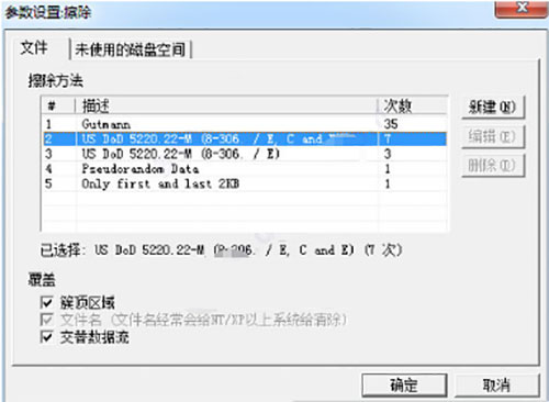 3、參數(shù)設(shè)置-擦除設(shè)置-文件和未使用的磁盤空間中的選項(xiàng)都要選中“2 US DoD 5220.22-M(8-306./E,C and E) 7次”,并點(diǎn)擊確定。
