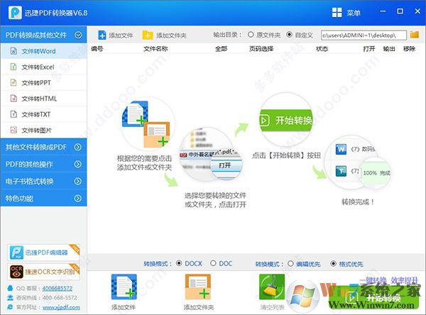 迅捷PDF轉(zhuǎn)換器界面簡潔、操作簡單,用戶只要下載到PC端就能輕松上手操作。沒有繁瑣的步驟,無需任何專業(yè)知識,點(diǎn)擊添加按鈕或拖拽需要轉(zhuǎn)換的PDF文件即可讓您輕松地將其轉(zhuǎn)換為想要的文檔。目前最新迅捷PDF轉(zhuǎn)換器提供了更多的文件格式轉(zhuǎn)換方式,方便用戶隨意轉(zhuǎn)換。