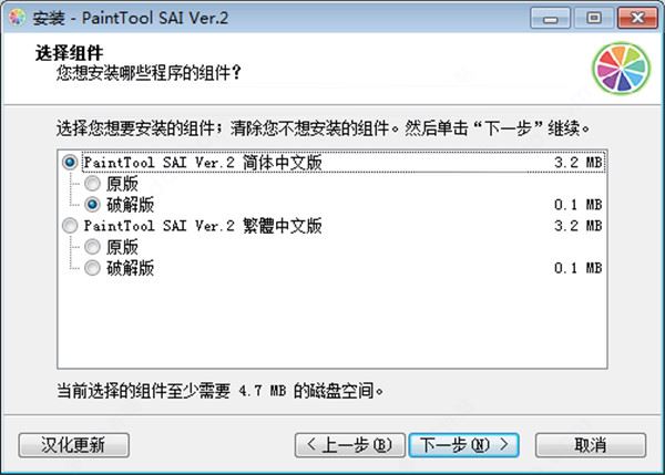 4、根據(jù)自己需求來選擇簡體中文或繁體中文的破解版本安裝組件;